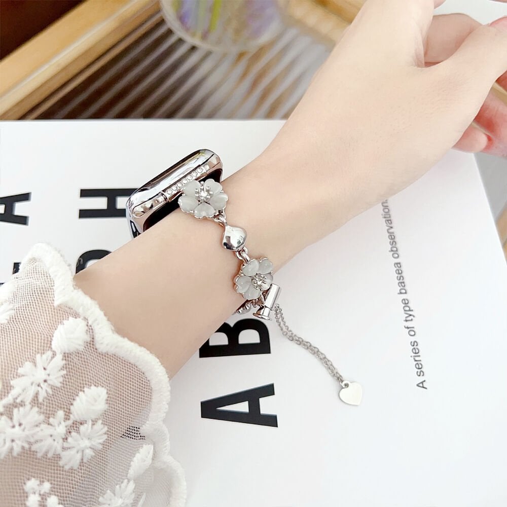 Apple Watch Seri 4 5 6 7 8 9 10 44-45-46mm Çiçekli ve Kalp Zincir Detaylı Bileklik Tasarım Kordon