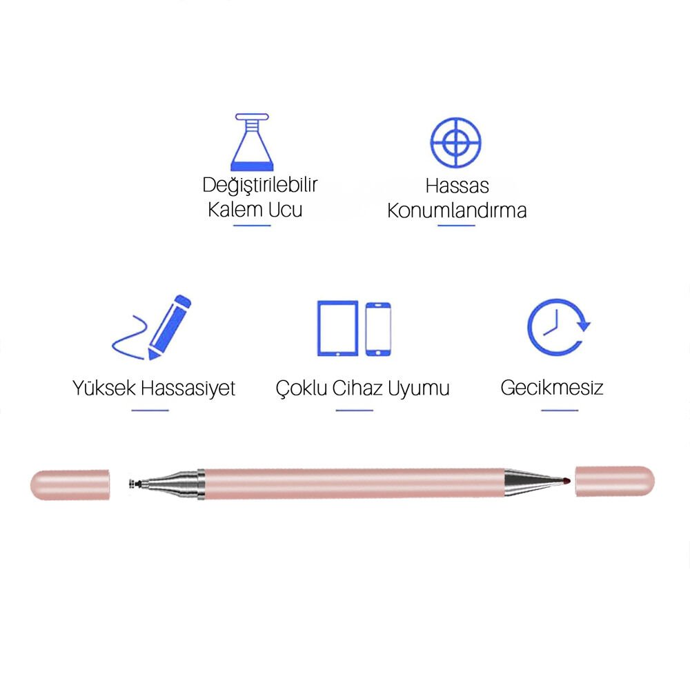 Telefon, tablet ve dokunmatik ekranlı tüm cihazlar için tasarlanan çift uçlu dokunmatik stylus kalem, yüksek hassasiyet ve gecikmesiz kullanım sunarak günlük kullanım, çizim ve not alma işlemlerini çok daha konforlu hale getirir.