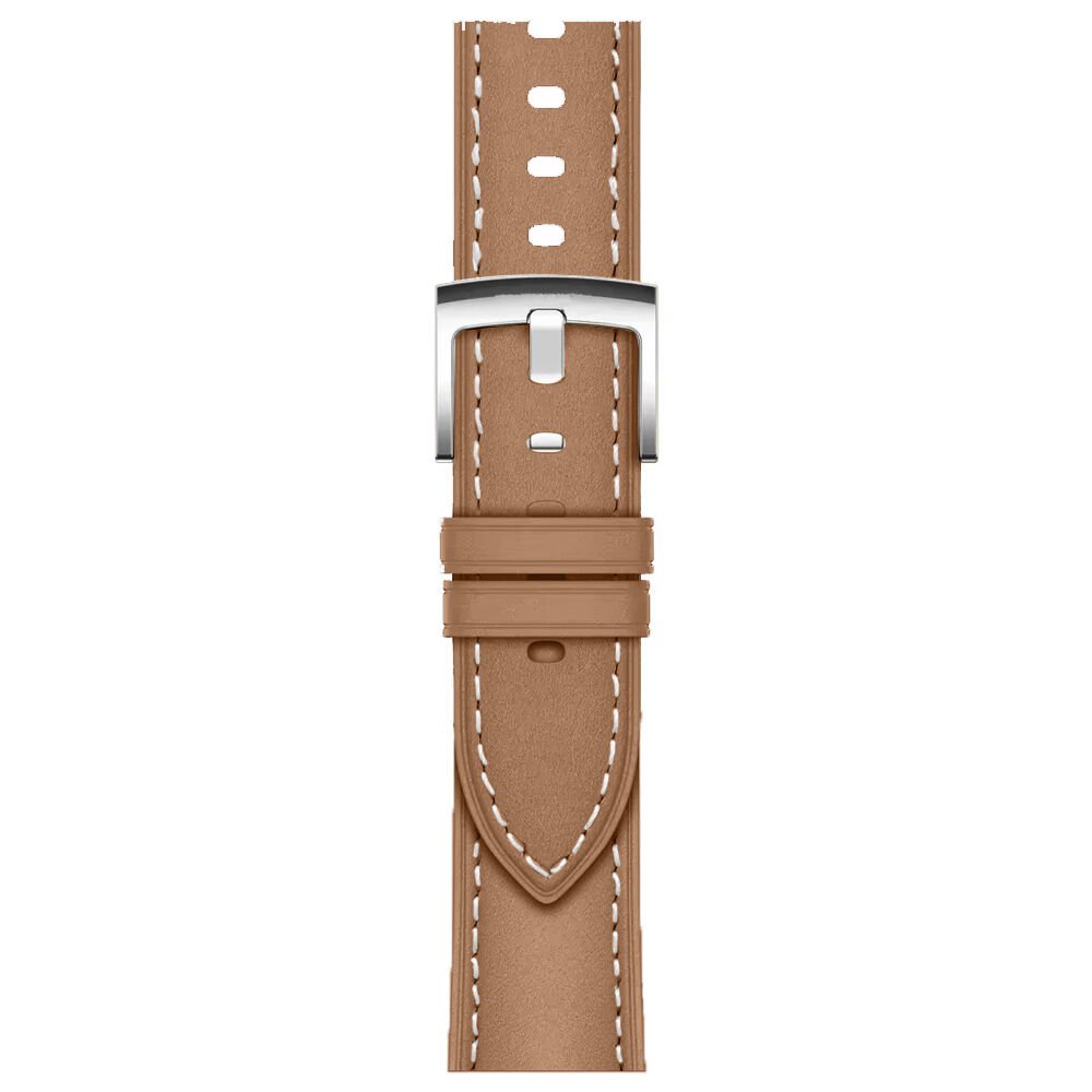 Akıllı saatinize klasik saat estetiği kazandıran deri görünümlü zarif kordon, gümüş metal tokası ve ince dikiş detaylarıyla hem günlük kullanımda hem de özel kombinlerde şık bir görünüm sunar. Minimal tasarımı sayesinde spor, klasik ve casual kombinlerle uyum sağlar.