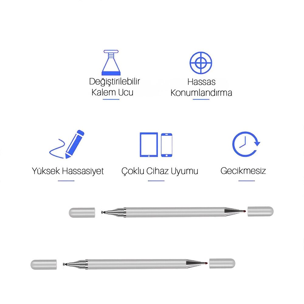 Telefon, tablet ve dokunmatik ekranlı tüm cihazlar için tasarlanan çift uçlu dokunmatik stylus kalem, yüksek hassasiyet ve gecikmesiz kullanım sunarak günlük kullanım, çizim ve not alma işlemlerini çok daha konforlu hale getirir.